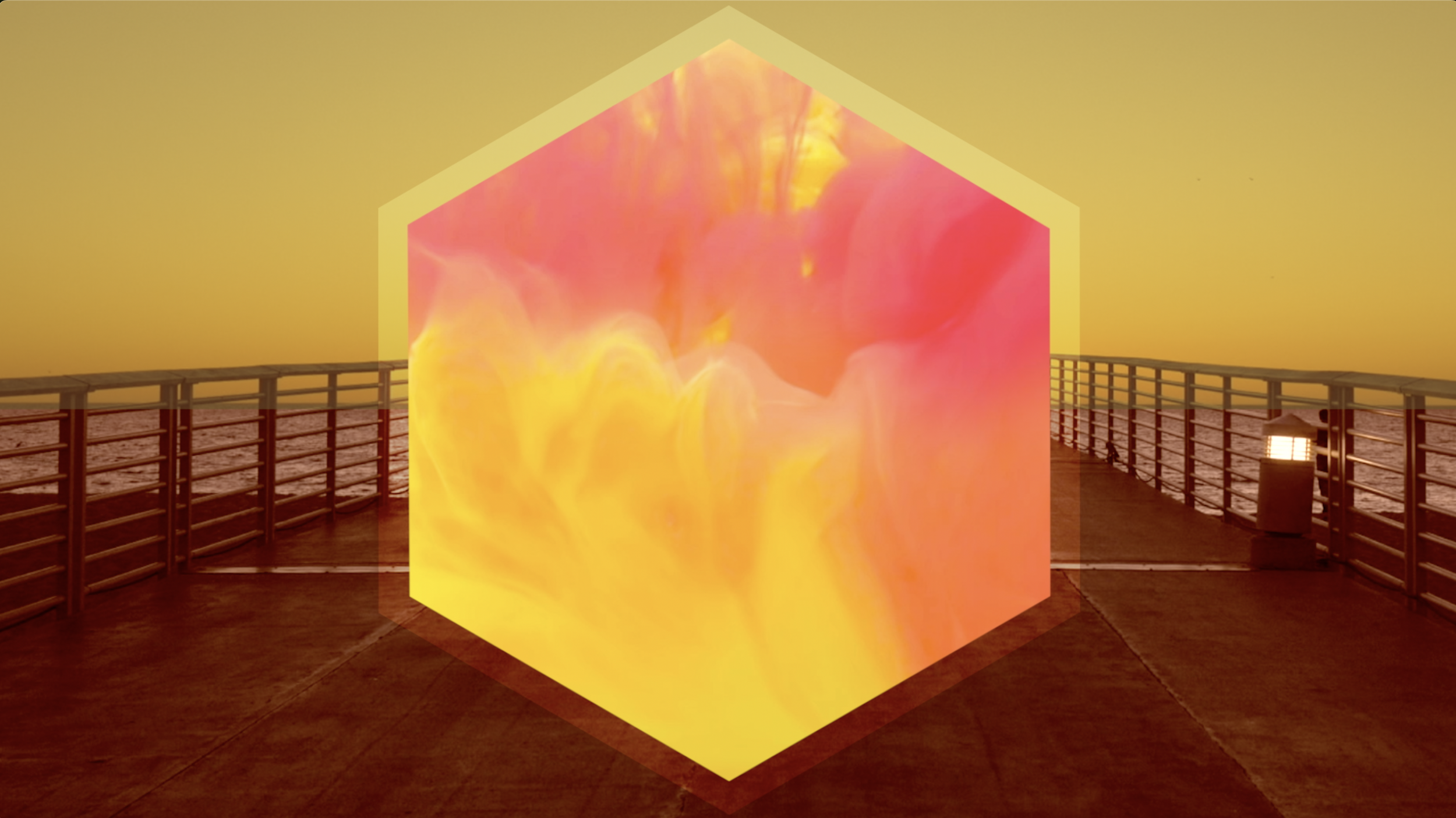 The California coastline becomes a dreamscape, where the past is tinted by nostalgia and the future glows with uncertainty. The landscapes are heavily colorized and processed, creating a surreal, otherworldly palette that reflects the emotional saturation of farewell and becoming. Each scene is anchored by a floating hexagon—a symbolic structure evoking strength, interconnection, and balance. As a sacred geometry often associated with harmony in change, the hexagon in this work becomes a portal: a space where movement and stillness coexist.